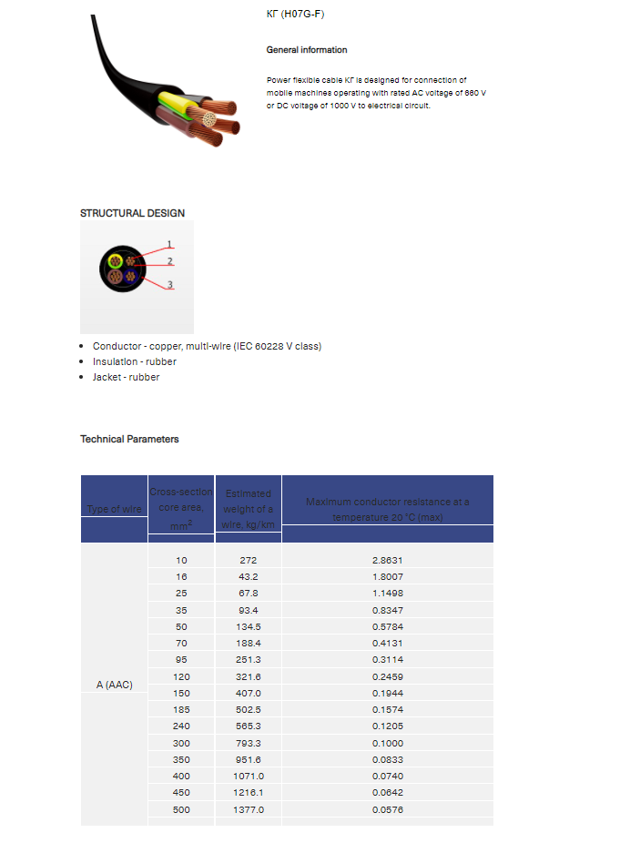 Place of use - Power flexible cable КГ is designed for connection of mobile machines operating with rated AC voltage of 660 V or DC voltage of 1000 V to electrical circuit