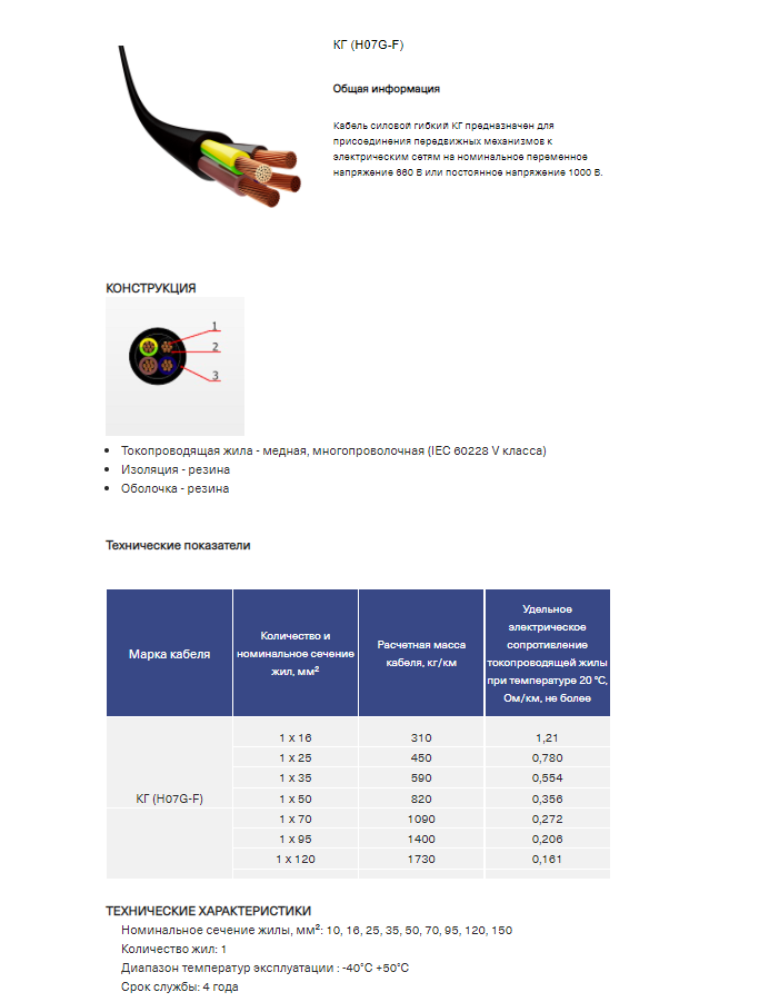 Место Использование - Кабель силовой гибкий КГ предназначен для присоединения передвижных механизмов к электрическим сетям на номинальное переменное напряжение 660 В или постоянное напряжение 1000 В